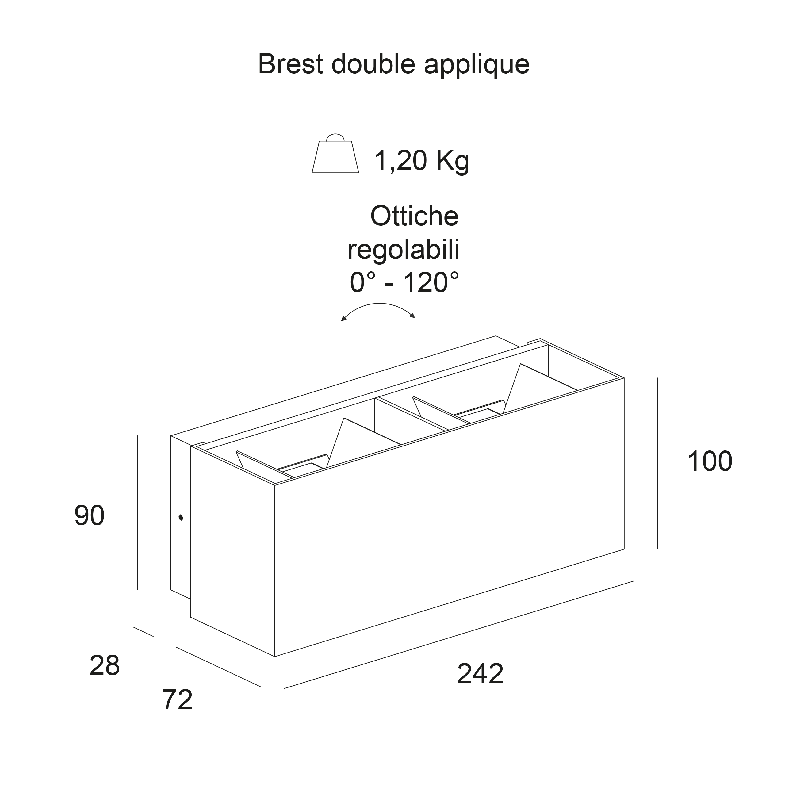 Apparecchio a LED a doppia emissione (uplight + downlight) per installazione a parete, indicato per valorizzare prospetti e materiali di rivestimento, il design minimale e la personalizzazione dell’apertura ottica rendono BREST perfettamente integrabile con qualsiasi tipo di architettura. Corpo, sistema di dissipazione passiva e lamelle per la regolazione dell’apertura ottica realizzati in lega di alluminio anodizzato e successivamente verniciato a polvere per fornire un’alta resistenza agli agenti atmosferici ed ai raggi UV. Schermo di protezione realizzato in lamiera di alluminio pressopiegata. Diffusore in policarbonato con effetto satinato “frost”. Sistema di fissaggio a parete tramite piastra in lega d’alluminio trattata e verniciata ugualmente al corpo lampada. Installabile su qualsiasi superficie piana mediante tassellatura.