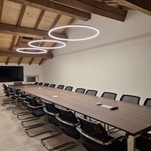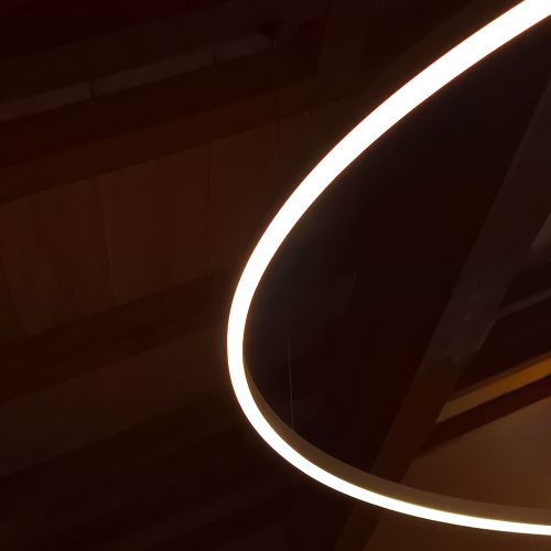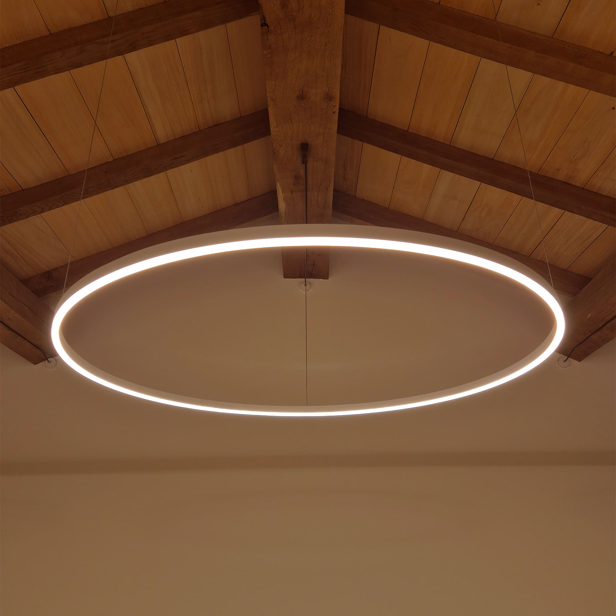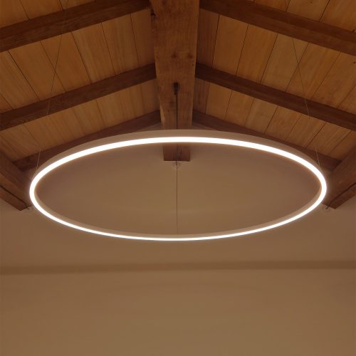 Corpo illuminante LED per installazione a sospensione di forma circolare di diametro 600mm, 900mm e 1200mm, realizzato in profilo di alluminio estruso rullato e senza punti di saldatura, verniciato a polvere e fornito con kit di sospensione completo di cavi L.4000mm. Indicato per illuminare hall, sale conferenze, ambienti polifunzionali o residenze private di pregio. Il profilo estremamente ridotto rende l’apparecchio leggero ed estremamente versatile per vari impieghi. Grazie allo speciale diffusore antiabbagliamento monopezzo in metacrilato opale, l’apparecchio risulta idoneo per essere installato in luoghi di lavoro con presenza di operatori per lunghi periodi. Caratterizzato da un’emissione luminosa verso il basso ed esterna.